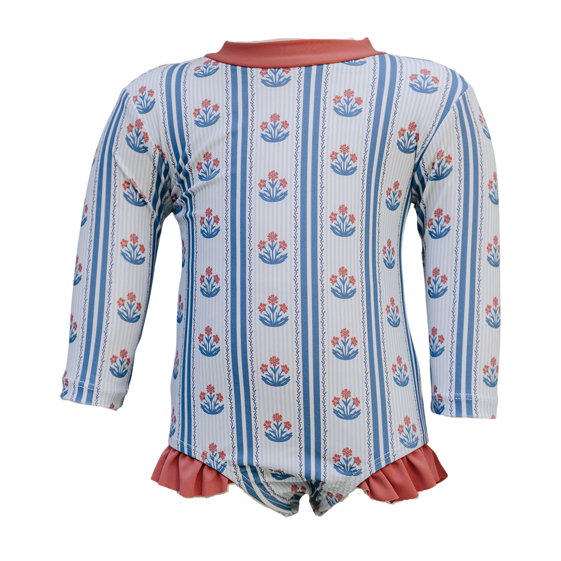 Designed with the sweetest details, it features long sleeves for added sun protection, it ties in the back to create an adjustable fit and the prettiest bow moment, while soft ruffles at the leg openings add an extra touch of charm. Made for comfort and movement, the lightweight, quick-drying fabric keeps them ready for beach days, pool parties, and everything in between. Classic florals, darling details, summer memories in the making!