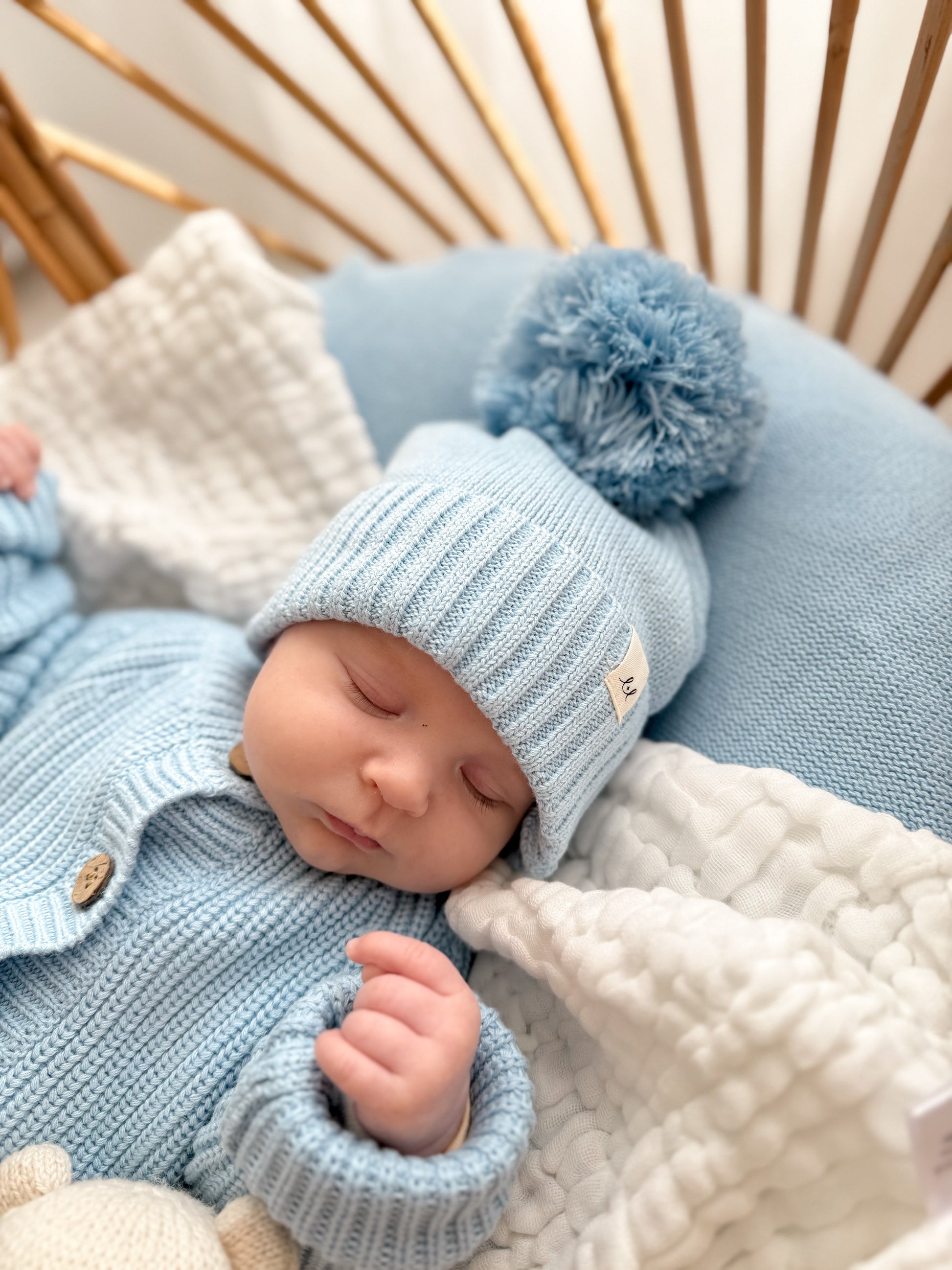 Introducing our adorable baby beanie with a playful pom on top, crafted with love from 100% organic cotton. This beanie is the perfect combination of style, comfort, and sustainability, ensuring a cozy and eco-friendly choice for your little one.
