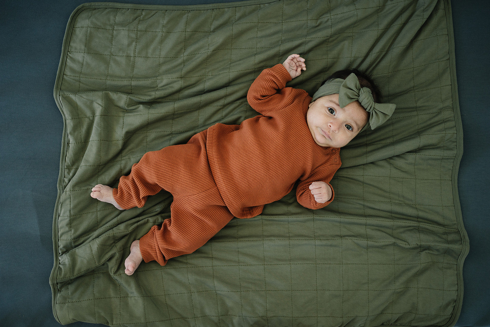 This is a one size head wrap that will fit size newborn and up. It is made out of a soft Bamboo Rayon. They are tied in a simple square knot making it easy to resize on your little ones head. We love how soft they are and the neutral designs they come in. They each have matching stretch knot gowns and swaddles in our shop.